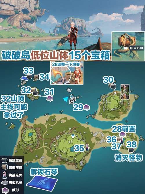 1、破破岛高提山有28个宝箱。21拿完3个需要调整一次指向演奏再飞一圈。