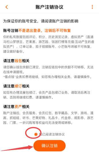 4、勾选我已阅读注销协议,点击确认注销即可。