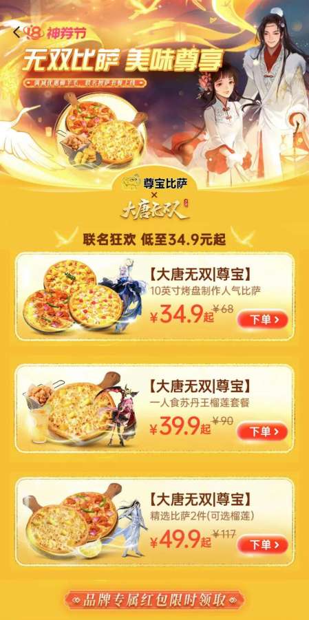 号外!号外!《大唐无双》手游与知名连锁比萨品牌尊宝比萨美味联动,在美团平台推出联名优惠套餐,更有尊享优惠券发发发,承包你从无双世界到美味世界的吃喝玩乐!
