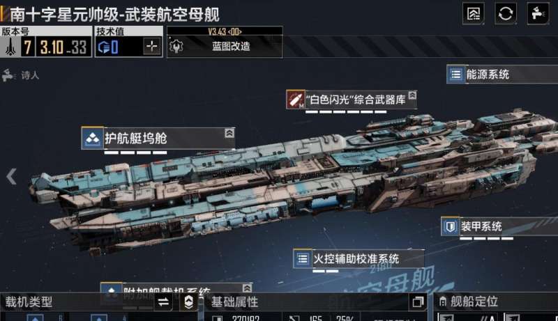 排行第三的是南十字星元帅级航母,它可以搭载至少十艘的舰船,总共分为四个系统,不同的系统有不同的属性加成。首先是A系统,选择合适的模块加点之后,就能够大幅度提高我方搭载舰船的能力。同时搭载平台有关的模块是初始模块,不需要玩家额外的选择。而A2护卫舰船坞模块需要抽取,但是获取难度不高,玩家遇到了需要无脑拿。