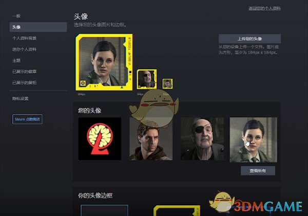 3、在个人资料页面再次点击右侧的头像栏,在头像栏中可以选择系统默认头像,或者自行选择上传一个头像,等待正常保存头像后,点击页面最下方的【保存】按钮即可保存steam设置。