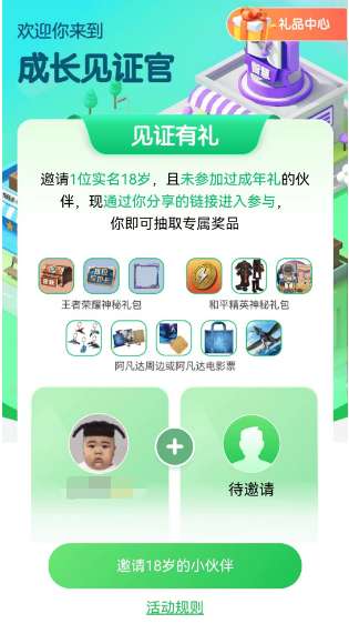 4、进入成人礼领取页面,玩家需要邀请1名实名18岁,且没有参加过本活动的伙伴。