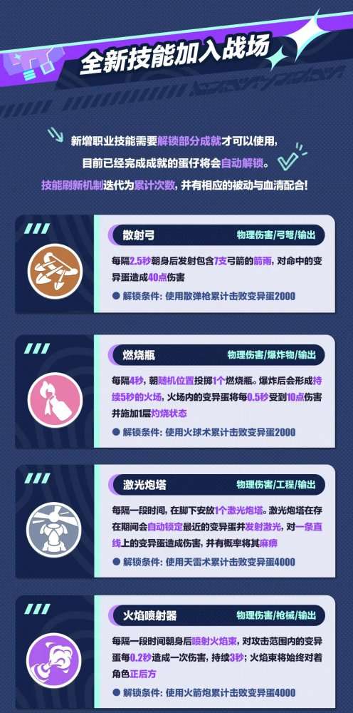 伴随着“变异蛋狂潮2.0”升级焕新,技能与超级血清也迎来了海量上新。四款全新技能“激光炮塔”“散射弓”“燃烧瓶”“喷火器”首度登场,为输出带来全新的畅爽体验,新增职业技能需要解锁部分成就才可以使用,目前已经完成成就的蛋仔将会自动解锁。