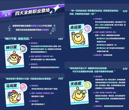 四大新增特种蛋职业隆重登场,在过往对局中满足解锁条件即可使用,已经完成成就的蛋仔将会自动解锁新职业。鬼魅无影的神行蛋,移速越高则全局伤害越高;享受未知的命运蛋,伤害与技能效果都交付命运决定;福星高照的天选蛋,通过不断累积幸运值造成更高的伤害;帽藏百宝的马戏蛋,随机生成道具为战局带来意想不到的变化。不同职业各有特色,等待蛋仔们解锁体验!