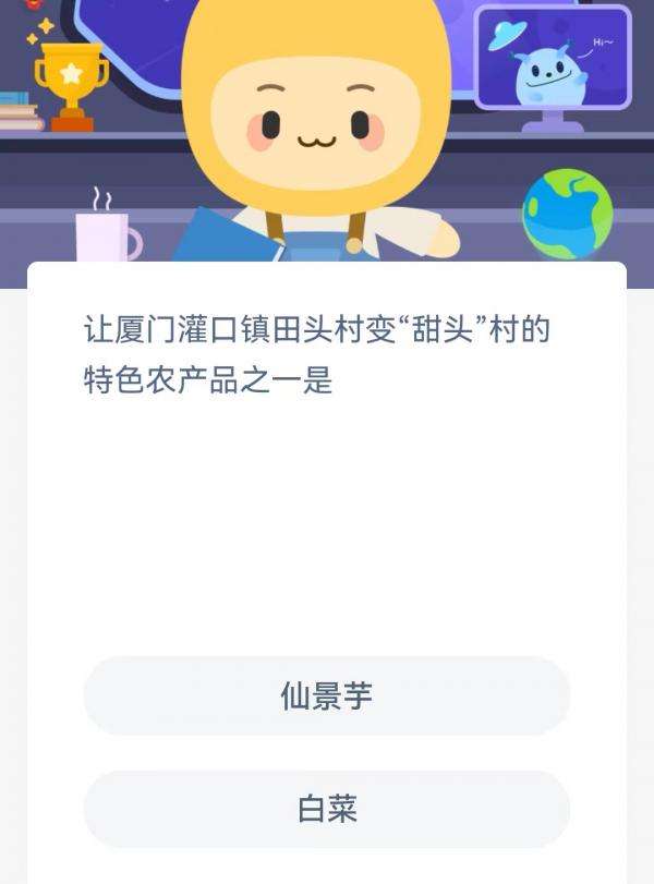 2022支付宝蚂蚁新村7月1日的题目为:让厦门灌口镇田头村变甜头村的特色农产品之一是?仙景芋还是白菜呢?很多小伙伴可能还不太清楚。下面小编就为大家带来了正确答案分享,希望能帮助到你。