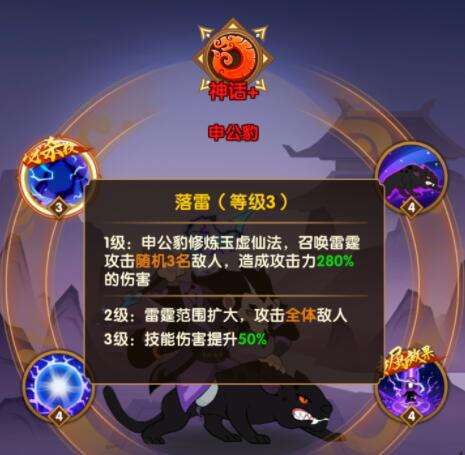 1级:申公豹修炼玉虚仙法,召唤雷霆攻击随机3名敌人,造成攻击力280%的伤害