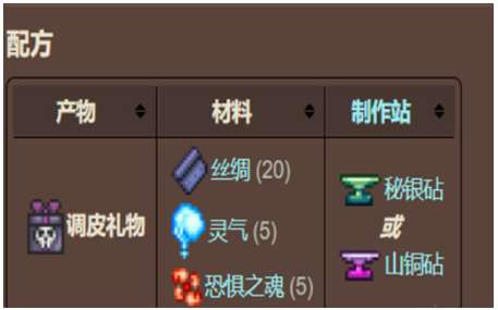 调皮礼物制作方法:丝绸 (20)、灵气 (5) 、恐惧之魂 (5)