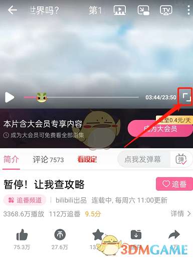 1、打开哔哩哔哩,点击进入番剧播放页面,点击右下角横屏播放。