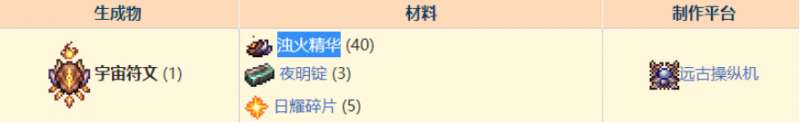 其次,宇宙符文 需要 40 个浊火精华 + 3 个夜明锭 + 5 个日耀碎片 合成。
