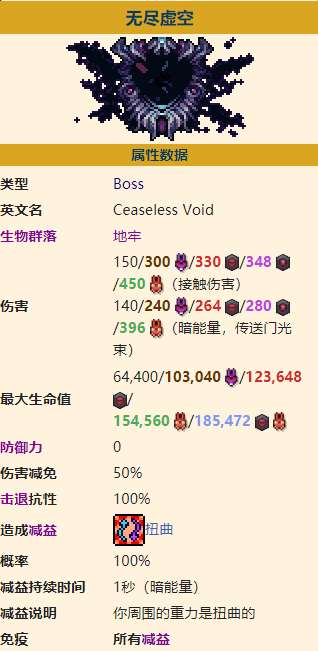 无尽虚空是泰拉瑞亚灾厄mod游戏中一个月球领主后的Boss,是神之仆从之一。无尽虚空会掉落暗物质,一种用来制作宇宙之虫和许多武器的重要材料。