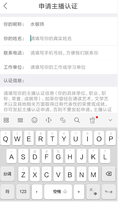 3、如果用户曾经在艺术方面取得过某些成就与荣誉,那么就可以发起主播认证申请,普通人发起申请被驳回的几率太大了!
