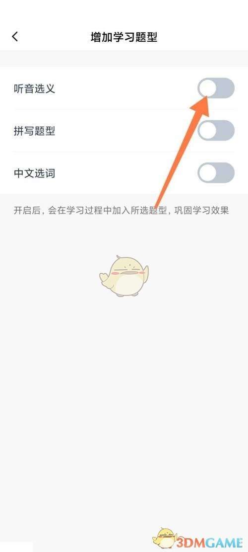 3、最后进入增加学习题型页面,点击打开【听词选义】,即百词斩听音选义开启完成。