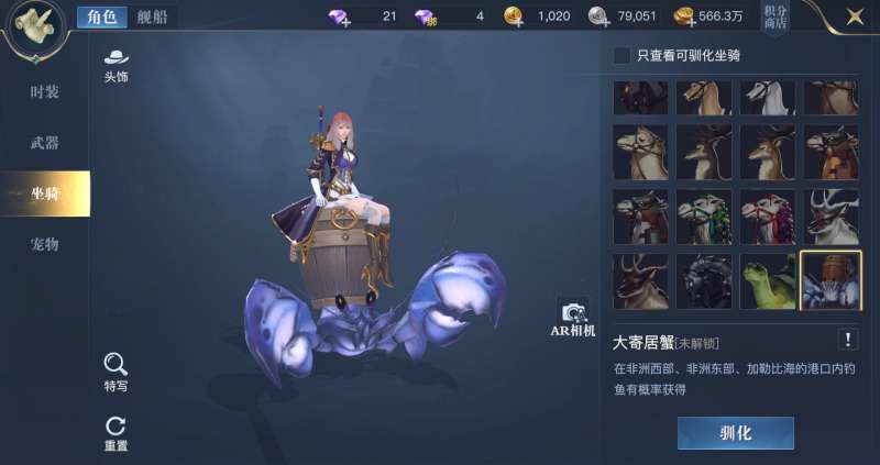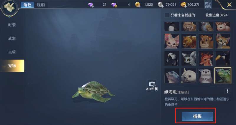 除了钓到简单的水产,钓鱼玩法还能获得一系列有趣的坐骑、宠物。我们可以在坐骑、宠物界面,选择目标点击下方驯服、捕捉按键,自动寻路至钓鱼处。也可以在港口水产分栏中通过剪影判断可获取的坐骑、宠物。