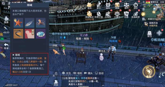 鱼群聚集效果可以让我们钓鱼获得坐骑、宠物、小点心几率提升一倍,所有鱼类上钩速度提高25%。每个海域通常会有1个鱼群聚集港口,每过1小时改变1次。想提升钓鱼效率的玩家可以跟随鱼群聚集每1小时更换一次港口。