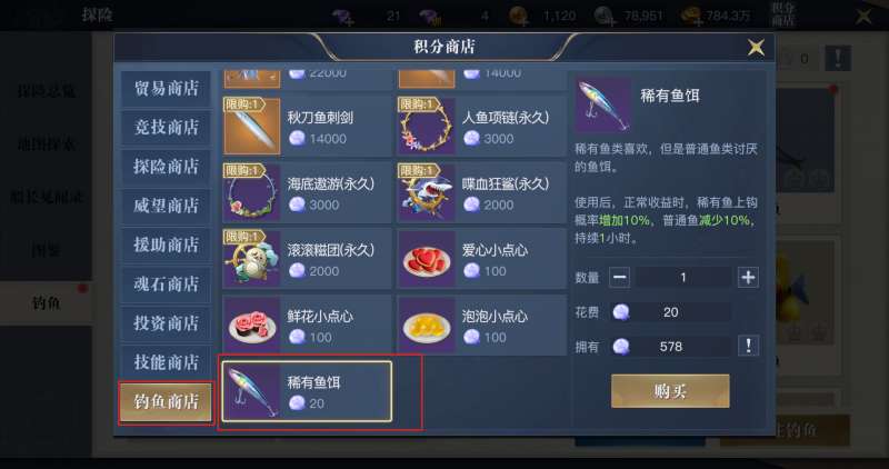 鱼群聚集可以让所有鱼类上钩速度提高25%。稀有鱼饵在钓鱼商店消耗20鱼币购买,可以增加稀有鱼概率10%减少普通鱼10%,持续一小时。
