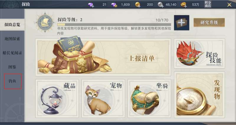 探索玩法在我们通过游戏序章后直接开启,我们可以在游戏界面右下角,点击“探险”进入探索玩法界面。进入界面后在左侧选择“钓鱼”即可查看钓鱼玩法内容。