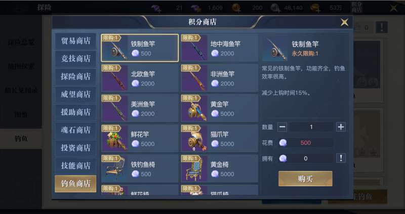 推荐大家优先购买铁制鱼竿、鱼椅,获取百分之15上钩、收杆属性过渡,随后慢慢积累购买5000鱼币的最终鱼竿即可。