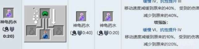 神龟药水:移动速度减缓到原来的 40%或者 10%,受到的伤害减少到原来的 40%或者 20%。