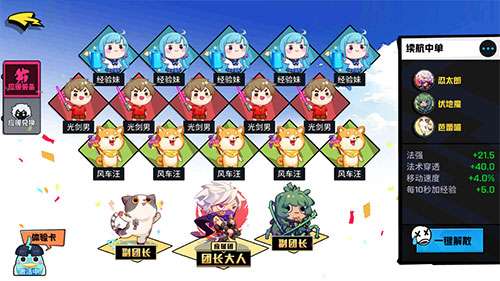 经验妹、光剑男和风车汪这一整套提供了孟婆前期较高的法强法穿,经验妹增加的少量经验可以让孟婆更快的升到4级,风车汪增加的4%移速可以让孟婆更快的游走支援。芭蕾喵提高了孟婆团战中的续航能力。
