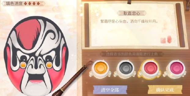 一张脸谱会有四个填色区域,可以通过上面的填色进度查看自己填色了几个区域,等到四个全部填满即可点击右下角的确认完成。