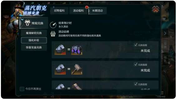 活动内容:活动期间可使用瓦雷利亚钢兑换不同的强化相关道具。