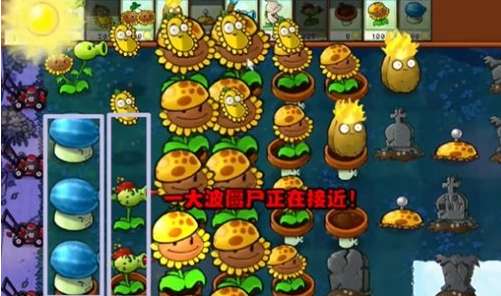 6、一个冰瓜大喷菇可以同时攻击三行僵尸,建议玩家分开放置,后期阳光充足的情况下可以多放。