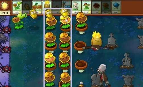 2、在第一波主要是收集阳光,所以在下图位置摆放两排阳光向日葵并在同样的位置叠加小盆菇。