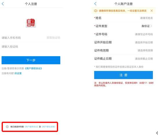3、输入常用手机号码和短信验证码,填写姓名和证件信息,点击注册即可。