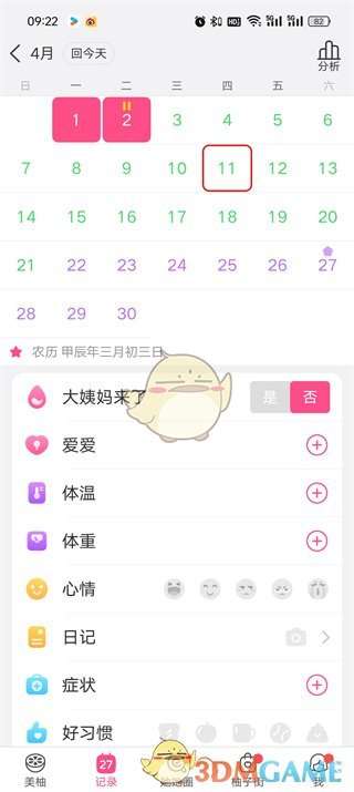 2、然后在记录的页面中可以记录今日体温、体重、心情等,我们向右滑动日历;