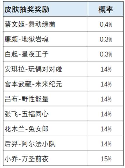 王者荣耀荣耀之战皮肤奖池介绍