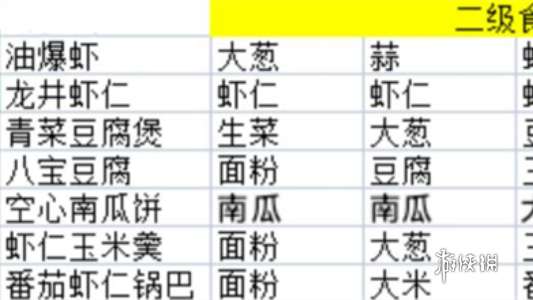 二、2级菜谱 1、油爆虾= 大葱+蒜+虾仁+虾仁。 2、龙井虾仁= 虾仁+虾仁+虾仁+虾仁。 3、青菜豆腐煲= 生菜+大葱+豆腐+虾仁。 4、八宝豆腐= 面粉+豆腐+玉米+虾仁。 5、空心南瓜饼= 南瓜+南瓜+大米+面粉。 6、虾仁玉米羹= 面粉+大葱+玉米+虾仁。 7、番茄虾仁锅巴= 面粉+大米+番茄+虾仁。