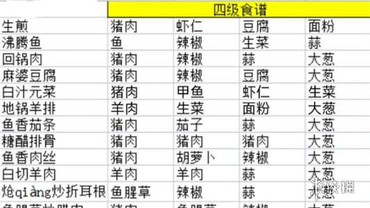 四、4级菜谱 1、生煎= 猪肉+虾仁+豆腐+面粉。 2、沸腾鱼= 鱼+辣椒+生菜+蒜。 3、回锅肉= 猪肉+辣椒+蒜+大葱。 4、麻婆豆腐= 猪肉+辣椒+豆腐+大葱。 5、白汁元菜= 猪肉+甲鱼+虾仁+生菜。 6、地锅羊排= 羊肉+生菜+面粉+大葱。 7、鱼香茄条= 猪肉+茄子+蒜+大葱。 8、糖醋排骨= 猪肉+猪肉+猪肉+大葱。 9、鱼香肉丝= 猪肉+胡萝卜+辣椒+大葱。 10、白切羊肉= 羊肉+羊肉+蒜+大葱。 11、炝炒折耳根= 鱼腥草+辣椒+蒜+大葱。 12、鱼腥草炒腊肉= 猪肉+鱼腥草+辣椒+大葱。 13、老妈蹄花= 猪肉+辣椒+面粉+蒜。 14、瓢儿鸡蛋= 猪肉+虾仁+玉米。
