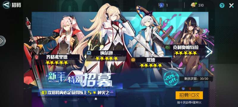 新手招募的话,就是只能抽30发,但是每十发只需要花八个电子名录。抽完这30次,这个池子就会消失,相当于新手福利吧,全弄就行的啦,不亏的。