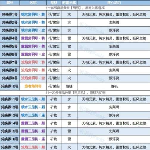 原材料收集矿石,沾染15s水元素,收集 史莱姆*1+狂风之核*1,由于狂风之核包含的元素更多,因此会按照第3类别来判定。即获得11号兑换券。