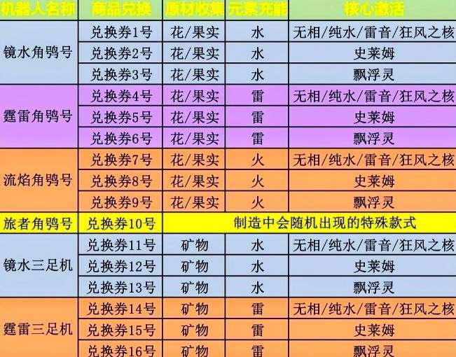 基本上机器人分为两款三动作各三属性,所以摇扇跟三足机器人各有9种,而10号与20号则是将摇扇跟三足的动作综合成一体,故选择上当然是以10号或20号为优先,因为一次就有三个动作。摇扇在制作时第一项是采收花果则必出1~10号,三足则是纯粹在第一项时仅采收矿石则必出11~20号。