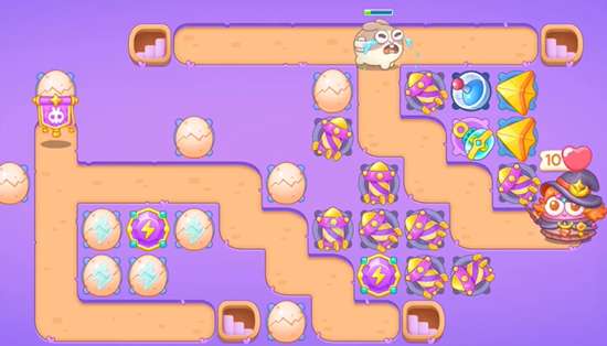 1、开局我们先在出口这里放置满级鸡蛋,然后在右边也放置鸡蛋清理周围道具,有怪过来先打怪。