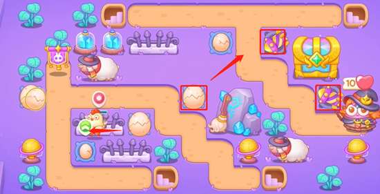 3、宝箱打出来我们在终点这里做好空中部署,左边我们还是放置鸡蛋清理道具增加伤害,拿到全清。