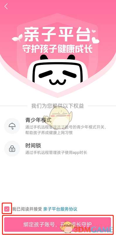 3、勾选阅读协议,点击绑定孩子账号,开启成长守护。