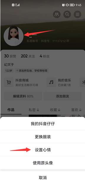 1、抖音仔仔创建好后,头像会自动变成仔仔形象,点击头像,在跳出的界面里点击设置心情。