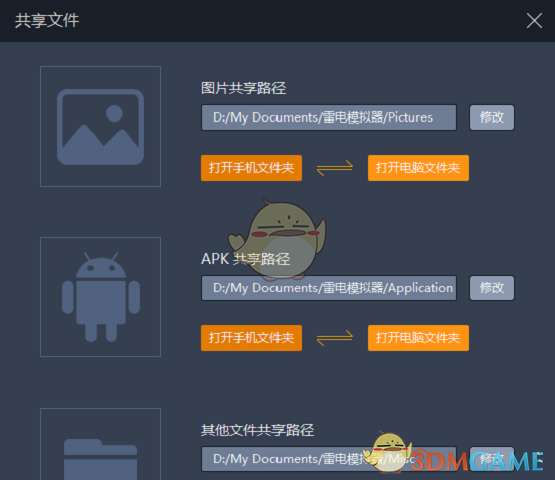 4、在“共享文件”界面可以看到有“共享图片、APK、文件”三种共享路径,由于我们想要将模拟器中的图片共享到PC中,所以我们先点击“图片共享路径”中的“打开手机文件夹”;