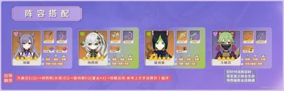 如遇敌人众多且分散的环境时,可考虑把[钟离+菲谢尔]替换成[温迪/万叶/砂糖+久岐忍],亦或者直接替换菲谢尔。