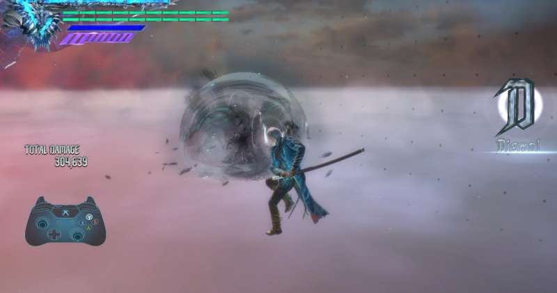 当维吉尔在使用太刀进行攻击的时候,任何一个动作都与次元斩接上四连击。但是每个动作里接入连招的时机都不相同的,需要玩家自己去感悟才行。在这里有个小技巧,打怪的时候玩家跳到空中,可将太刀瞄准地面长按普攻键。如果松手时间比较短,那么就要立刻按下坠下键,将其转变成坠击斩,可以减少一部分所受到的伤害。