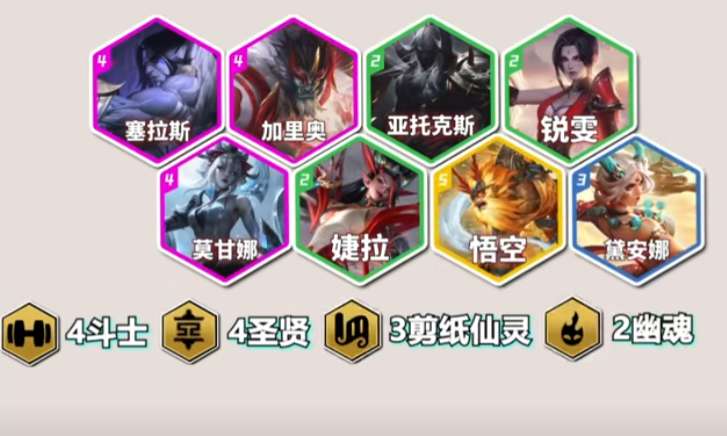 在阵容搭配上,是由主C塞拉斯、主坦加里奥加上瑞文、剑魔组成四斗,婕拉、皎月、莫甘娜、猴子开出四圣贤,同时这样的搭配还能开出三剪纸召出天使,2幽魂增加额外的输出,这样的羁绊构成也是选择瑞文和剑魔的原因。由于猴子作为一张五费卡,八级的时候D到的概率还是比较小的,玩家在没找到之前可以用拉露恩或者索拉卡打工,尽量补出对主C塞拉斯有利的羁绊,九级再上五费卡洛提升队伍的上限。