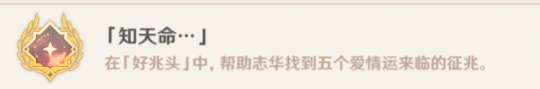 原神游戏中成就非常多,成就知天命是刷到璃月每日委托“好兆头”每日委托,并按照要求完成任务后达成的成就。首先和志华对话,在追踪到志华在哪里,和志华对话以后,志华会说爱情这种东西远在天边近在眼前,点击【你在说什么?】,志华就会说关于爱情运,让我们去找找征兆,在我知道了和你为什么不自己去中选择【你为什么不自己去】,接着就可以触发好兆头了。