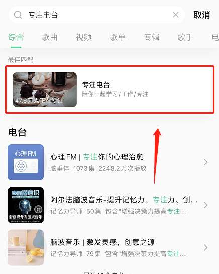 2、在此输入专注电台进入搜索,最上方就是专注模式入口。