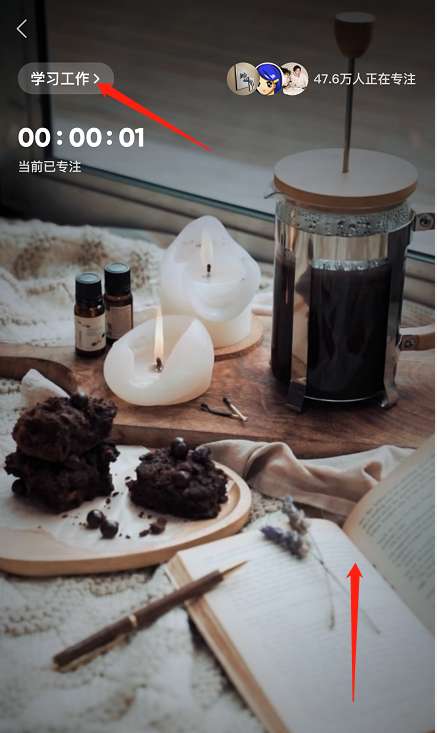 3、进入后就自动进入了专注模式,页面便会开始计时,用户们可以上滑切换模式,或者点击学习工作字样处。