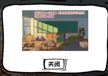 通关方法:将垃圾放入垃圾桶、使用黑板擦擦干净、黑板将物品放入纸箱保证教室的干净就可以通关。
