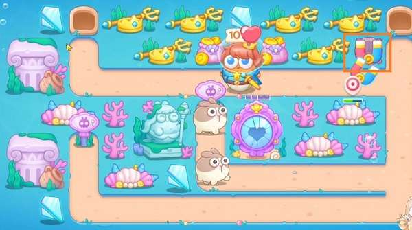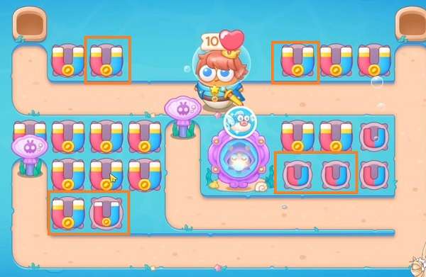 5、后期沿着兔子经过的道具造满磁铁,上方出口两边可以多造一些,单炮塔顺利通关。