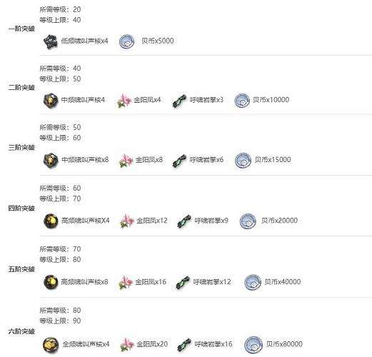 3、三阶突破:中频啸叫声核x8、金阳凤x8、呼啸岩拳x6、贝币x15000