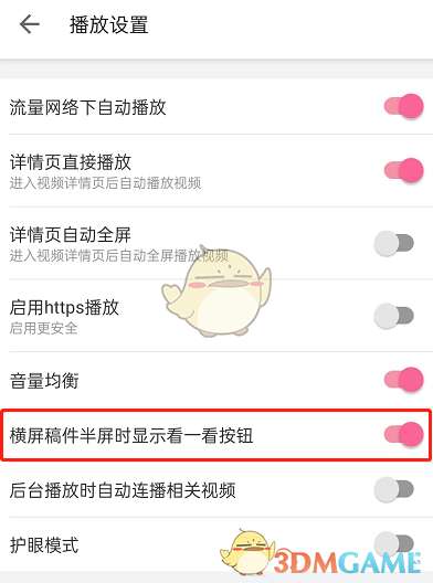 3、找到横屏稿件半屏时显示看一看按钮,将右侧开关关闭即可。